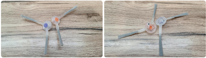 Боковые щетки стали для меня неожиданностью. Во-первых, они двух лучевые, а во-вторых имеют свое направление установки. Боковые щетки просто защелкиваются на направляющих, а для удобства выполнены в индивидуальных расцветках. На месте третьего луча находится своеобразный резак для волос, которые могут накручиваться на вал щетки.