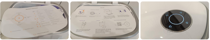 Верхняя крышка имеет окно с сенсорным управлением. А под крышкой изначально размещалась бумажная инструкция по первому запуску. Здесь же есть QR-код для загрузки мобильного приложения. Управление сенсорное. Активное поле подсвечивается в случае возможного запуска. К примеру, если робот-пылесос находится на станции самоочистки, то данная кнопка будет неактивна.