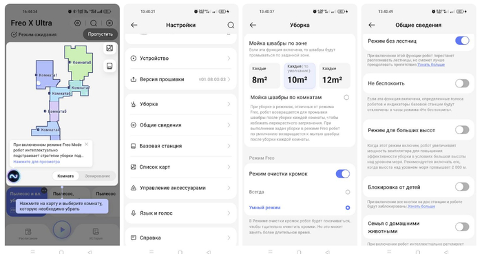 В автоматическом режиме Freo можно выставить режим очистки кромок. И тогда робот будет более детально очищать края помещений, но на это уходит больше времени. «Режим без лестниц» позволит лучше преодолевать препятствия, но включать его лучше в помещениях, где нет обрывов. Пользователь может самостоятельно выставить интенсивность сушки насадок из 3 вариантов. Они отличаются скоростью сушки и затраченной энергией.