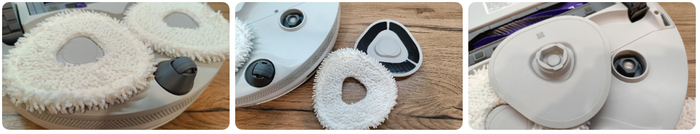 Модуль влажной уборки состоящий из съемной базы и тканевой насадки имеет не выраженную треугольную форму. Насадка из мягкой микрофибры, которая отлично отчищает различные пятна и собирает оставшийся мусор после сухой уборки. Основание удерживается на мощных магнитах.
