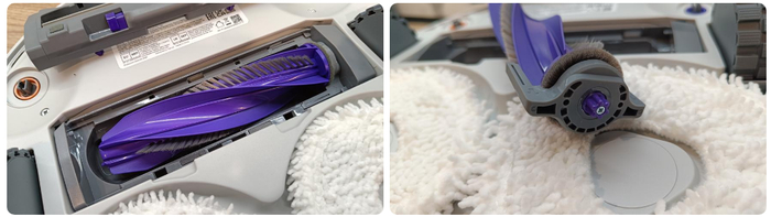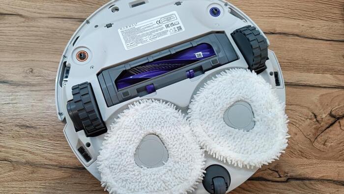 На нижней части размещается несколько датчиков обрыва, УЗ датчик ковров, боковые щетки, роликовая щетка с не запутывающимся циклонным отражателем, ведущие и направляющие колеса. Модуль влажной уборки из двух насадок.