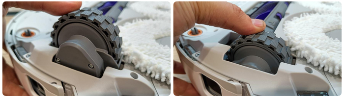 Ход ведущих колес достигает 30 мм. Резина средней жесткости, но по гладкой и влажной плитке не скользит.