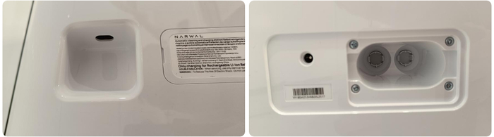 Парковочная база состоит из съемного поддона для очистки и чистящей базы. Изначально они установлены внутри базовой станции, но при необходимости могут быть извлечены для очистки. Внутри можно наблюдать контакты для заряда аккумулятора.