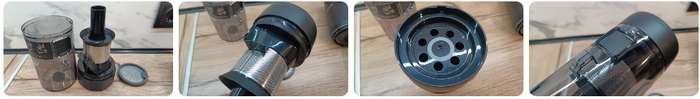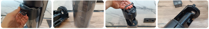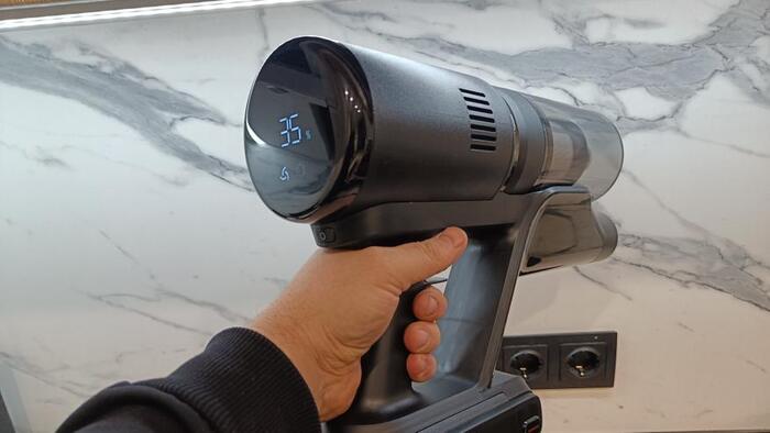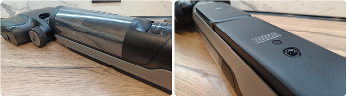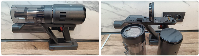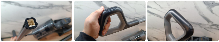 Ручка устройства пистолетного типа, а верхняя часть содержит съемные элементы. Это контейнер для мусора и моторный отсек с индикацией. Снизу ручки устанавливается аккумуляторный блок. Все элементы на защелках и надежно удерживаются. У контейнера есть уплотнительные элементы не только на фильтре, но и местах соединения.