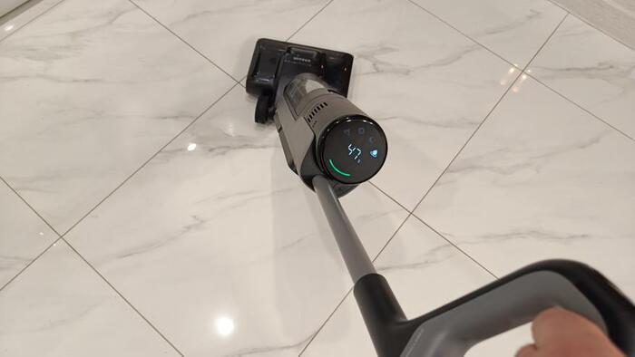 Каждый пылесос имеет свои органы управления, хотя блок двигателя и аккумуляторы у них общие. Пылесос для сухой уборки включается по нажатию на клавишу, а переключение режимов по нажатию на кнопку под блоком двигателя. В устройстве всего 2 режима работы: номинальный и максимальный. При этом на экране будет меняться пиктограмма режима. Кроме того, на экране отображается остаточный заряд аккумулятора.