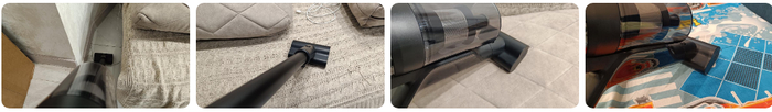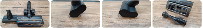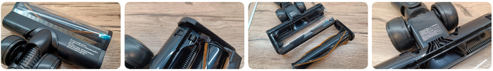 Выбор насадок позволяет убираться на различных поверхностях и труднодоступных местах. Основная щетка с подсветкой и вращающимся валиком. Можно разобрать и обслужить. На самой щетке есть множество пластиковых зубьев, которые не дают наматываться на валик длинным волосам, шерсти или ниткам. Это упрощает обслуживание и продлевает время жизни расходникам.