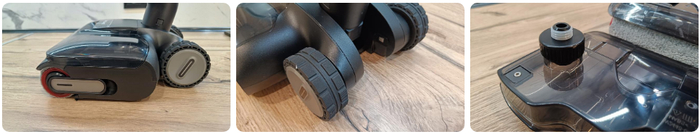 Отсек для чистой воды вынесен на чистящий блок. Таким образом, блок наполненный водой дополнительно прижимает чистящий валик для очистки пола. А контроль наполняемости упрощается, так как блок из прозрачного пластика. Для увеличения эффективности очистки рекомендую использовать фирменное средство. На платформе размещается съемный обслуживаемый ролик, который удерживается на магнитном фиксаторе. Чтобы извлечь ролик потребуется лишь потянуть его на себя за пластиковую направляющую. Колеса большие с резиновым протектором, не царапают деликатные покрытия. В основании есть резиновый скребок, который более качественно очищает ворсовую щетку.
