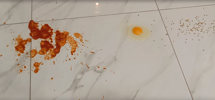 Влажная уборка проводилась с использованием жидкого и твердого мусора. На полу была томатная паста, сырое яйцо и перловка.
