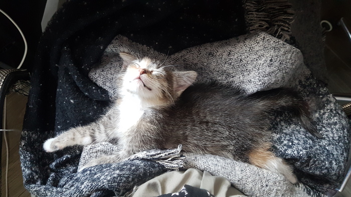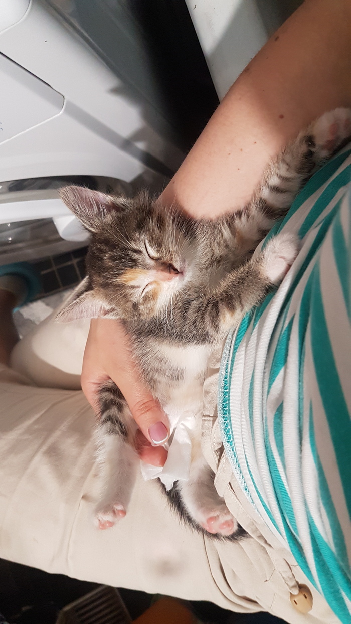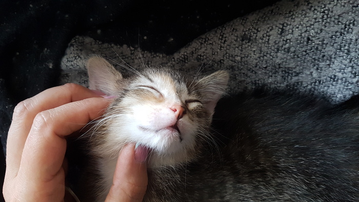 Зверюшка оказалась чистенькой и вполне ручной. Была помыта и немного накормлена. Немедленно уснула на руках)