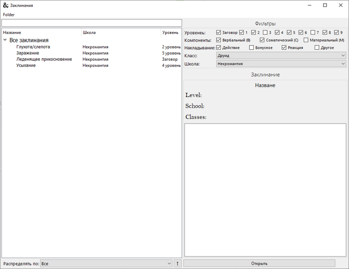 Доделал фильтр заклинаний и распределение заклинаний по разным группам (классы, школы, уровень)
