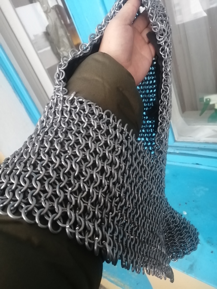 В серьёзную зарубу не пойдёт-материал алюминька 2мм (примерно-штангенциркуля нет под рукой) , плетение 4в1. Но, на ролевку или косплей самое оно)) шелестит как настоящий, а весит мало. Подшиты нащечники чтоб у суровых бородатых мужиков бороды не выдрать. Но больше пойдёт девушкам все таки именно из-за веса.