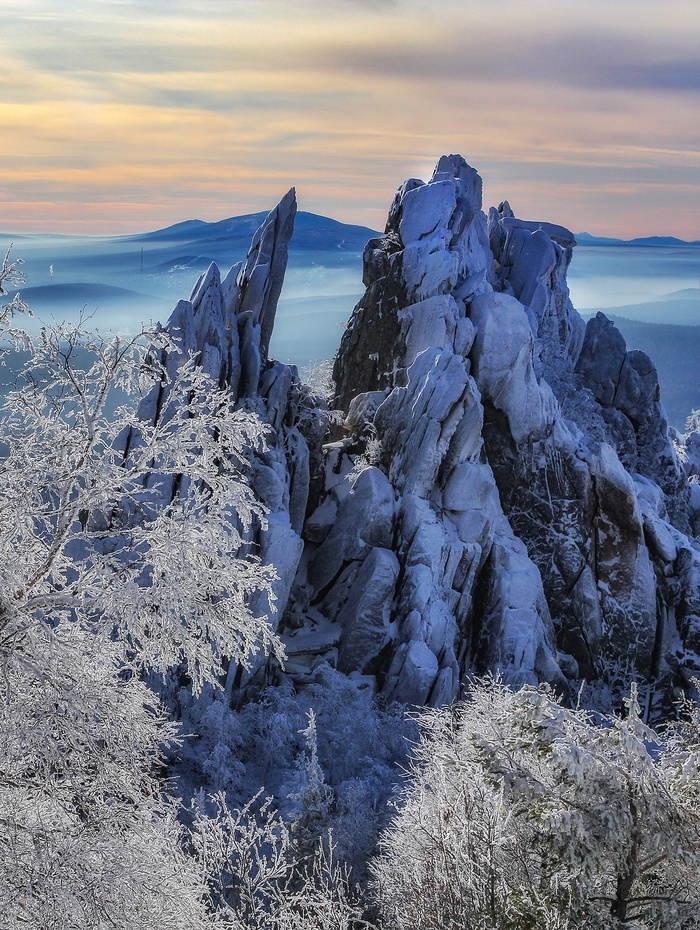 На фото Скалодром на закате и днём. Вдали в дымке г. Златоуст.