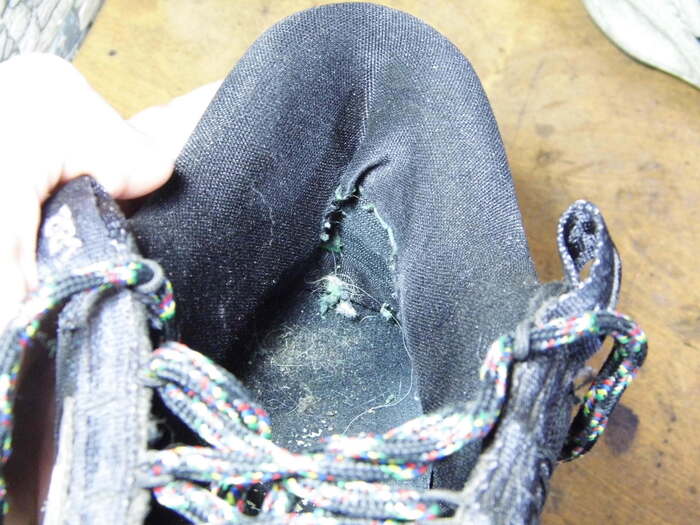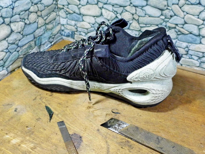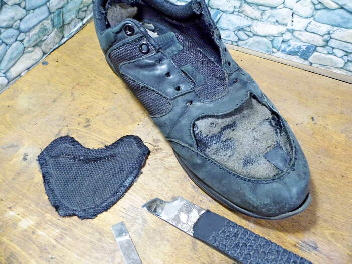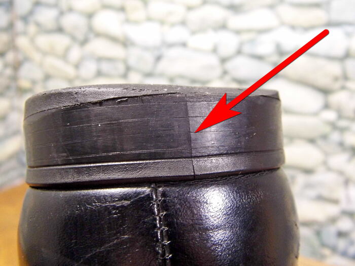 Сейчас уже нельзя сказать - были трещины до установки набойки или появились уже потом. Это сейчас и не так важно. Важнее думать, что вот с этим вот делать. По-хорошему - надо менять подошвы. Но это уже крупный ремонт. И далеко не факт, что подберём такую. Поэтому нужно ремонтировать то, что имеем. И набойка будет играть не совсем типичную для неё роль - удерживать подошву от разрушения. Как в том анекдоте.