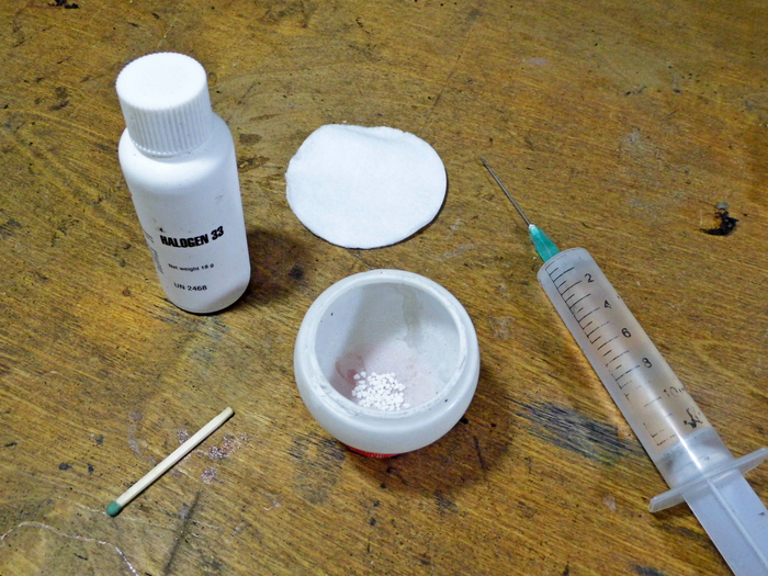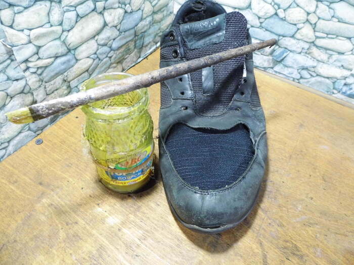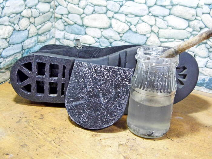 Так как на набойку возложены повышенные обязательства, протравим подошву для усиления адгезии клея. Готовим раствор.