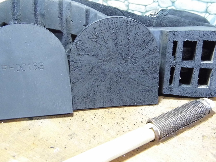 Снимем распирающие нагрузки с подошвы и перенесём их на основную стельку. Для этого заполним микропорой решётку. Фиксируем полихлоропреновым клеем - просто чтобы эти кубики не вывалились при зачистке.