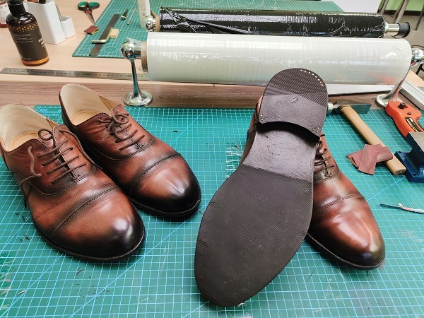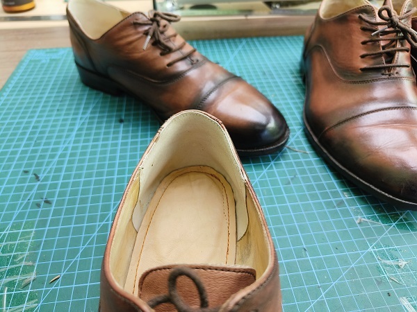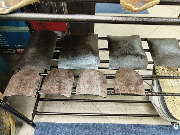 Первый этап, это чистка и увлажнение кожи седельным мылом. Пена наносится. но не смывается. Просто тщательно вытираем её тканью или салфетками. Полочка для досушивания и перехода на следующее рабочее место. На финишном столе на кожу наносится крема и воски. Крем, как правило, тонирующий и в этом случае, подкрашивание не потребуется. Крем наносится мягкой тканью или губкой. Затем тщательно располировывается щетками. Мысы слегка затемняются другими кремами, а небольшое количество бесцветного воска придает финишный лоск.