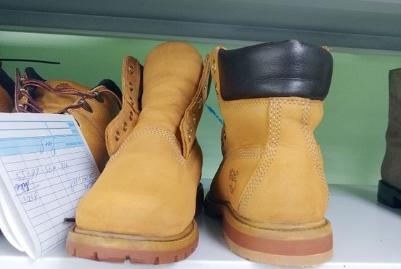 На этом столе, в основном, я рассматриваю все то, что присылают нам через логистические службы доставки. После осмотра составляется накладная с перечнем работ и их стоимостью, а обувь или аксессуары выкладываются на стеллаж в ожидании приема решения клиентом.