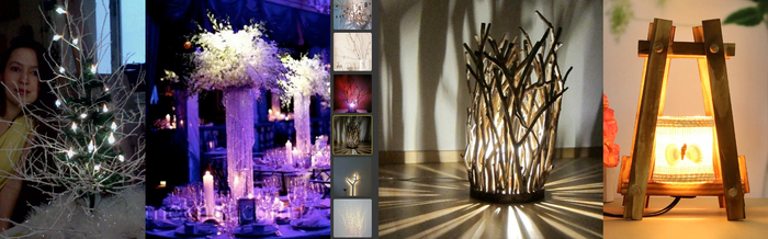 Можно использовать готовые настольные светильники , а можно сделать их самостоятельно, используя решения с подключением патрона или гирлянды в декоре с крашенными ветками, вазами, новогодней мишурой и т.д.