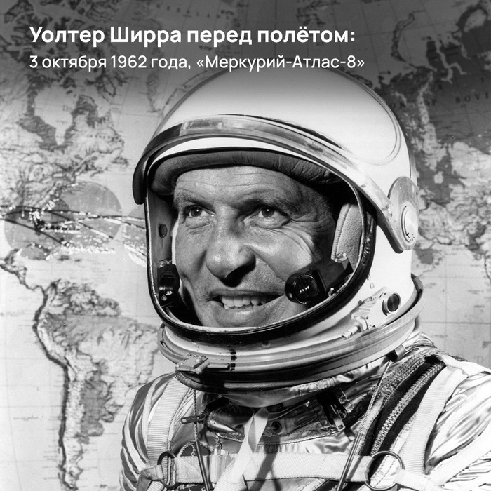 — Уолтер Ширра — третий орбитальный полёт США, 3 октября 1962 года, «Меркурий-Атлас-8». Астронавт совершил шесть витков, во время которых, в ходе прочих экспериментов, производил первую военную ДЗЗ Земли на предмет старта вражеских ракет. В момент прохождения корабля над полигоном Вумера в Австралии производились запуски осветительных ракет, но источник не удалось идентифицировать из-за облачности. Второй полёт — «Джемини-6А» вместе с Томасом Стаффордом. Третий полёт — «Аполлон-7» 11 октября 1968 года (Уолтер Ширра, Уолтер Каннингем и Донн Айзли). Данный полёт стал первым пилотируемым по программе «Аполлон». В 1969 году Ширра уволился из NASA.