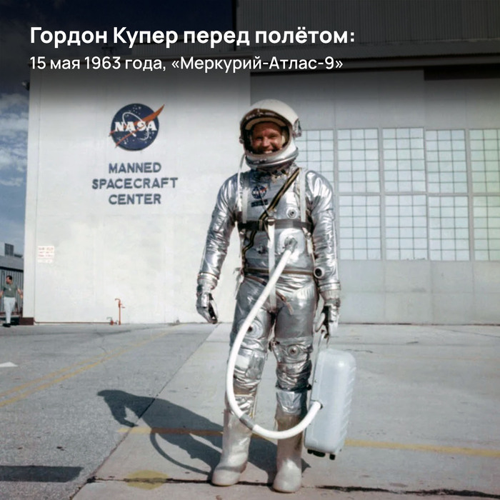 — Гордон Купер — четвёртый орбитальный полёт США, 15 мая 1963 года, «Меркурий-Атлас-9». Программа выполнена и даже перевыполнена (дальнейшие полёты по программе «Меркурий» приостановлены). Второй полёт — «Джемини-5», Гордон Купер летал вместе с Чарльзом Конрадом с 21 по 29 августа 1965 года. Третий полёт так и не состоялся. В 1969 году Купер — дублёр на «Аполлоне-10», а позже — претендент на полёт на корабле «Аполлон-13», однако в основной экипаж не попал. В 1970 году ушёл из NASA, стал заниматься частным бизнесом и всерьёз посвятил себя уфологии.