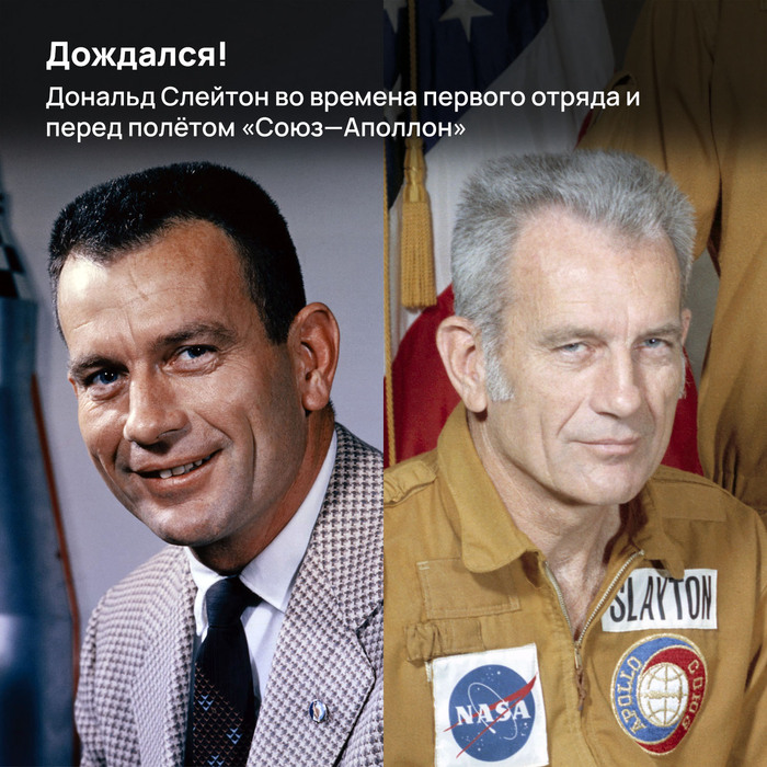 — Дональд Слейтон. Бедняга, который ждал своего полёта 16 лет. Первоначально Слейтон должен был совершить суборбитальный полёт на корабле «Меркурий-Редстоун-6» осенью 1961 года. Однако, после двух успешных орбитальных полётов Юрия Гагарина и Германа Титова, количество планируемых суборбитальных полётов было сокращено. Слейтон должен был совершить первый американский орбитальный космический полёт. После двух успешных американских суборбитальных полётов, которые совершили Алан Шепард и Вирджил Гриссом, руководство NASA отказалось и от третьего планировавшегося суборбитального полёта. В итоге, Джон Гленн был назначен в первый орбитальный полёт на корабле «Меркурий-Атлас-6», а Слейтон — во второй орбитальный полёт на корабле «Меркурий-Атлас-7». Но, 15 марта 1962 года Слейтон был отстранён от космических полетов из-за проблем с сердцем. 24 мая 1962 года вместо Слейтона на корабле «Меркурий-Атлас-7» в космос отправился Скотт Карпентер. Дональд Слейтон остался единственным астронавтом из первой семёрки, не совершившим в то время космический полёт.