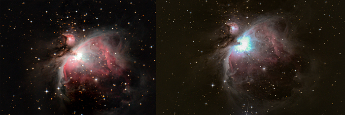 Вроде бы получилось получше, чем раньше. Для сравнения следующая картинка. Слева - результат сложения 81 кадра с выдержками по 30 с без гидирования, справа - результат сложения кадров, описанных выше: