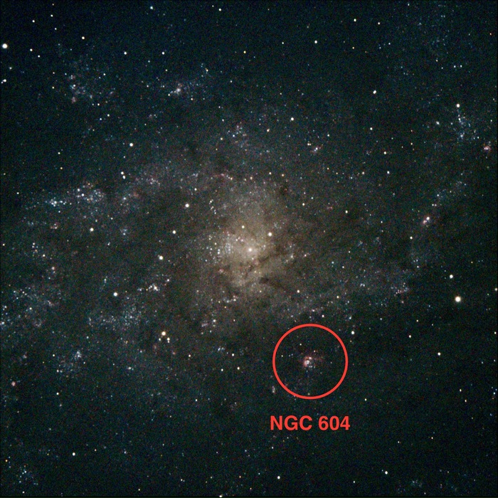 В её спиральных рукавах находится огромное количество областей звездообразования. Самая известная NGC 604, гигантская туманность, в сотни раз больше туманности Ориона, которую я показывал в предыдущем посте - M42 Туманность Ориона и рождающиеся в ней звезды. Показываю в свой телескоп!, но туманность Ориона находится от нас на расстоянии 1340 световых лет, a эта туманность в другой галактике за 3 000 000 световых лет от нас и мы достаточно хорошо видим этот интергалактический объект на простой любительской фотографии.