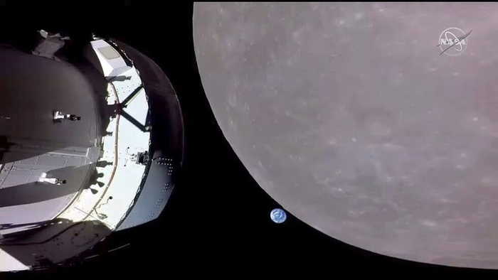 На этом снимке, сделанном космическим кораблем НАСА Orion, показан его вид непосредственно перед тем, как аппарат пролетел за Луной. НАСА