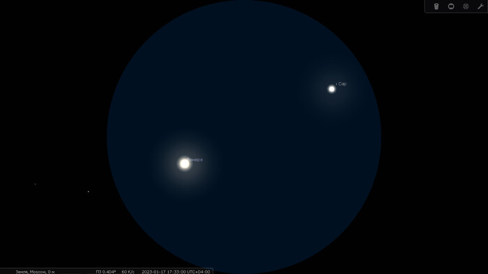 Вечером 17 января Венера пройдет всего в 10 угловых минутах от звезды ι (32) Козерога 4-й звездной величины. Это довольно тесное сближение, но по сути своей совершенно иллюзорное. Звезда ι Cap удалена от нас на 200 световых лет, является желтым сверхгигантам, поверхность которого обильно, но неравномерно покрыта темными пятнами (подобными солнечным, но в большем количестве и размерах). При вращении звезды к нам обращено более или менее запятнанное полушарие звезды, из–за чего яркость этой звезды для земного наблюдателя меняется в небольших пределах.