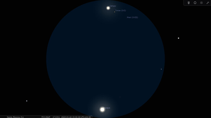 Сатурн и Венера при наблюдении в телескоп с небольшим увеличением 22 января 2023 года