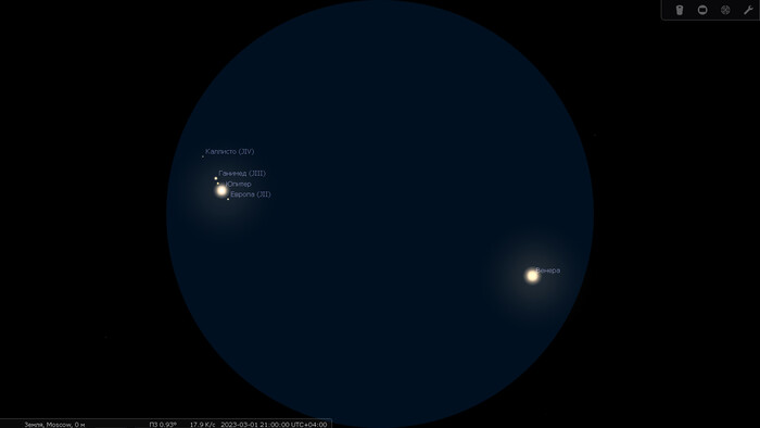 Юпитер и Венера при наблюдении в телескоп с небольшим увеличением 1 марта 2023 года. Характерная локация — Европа