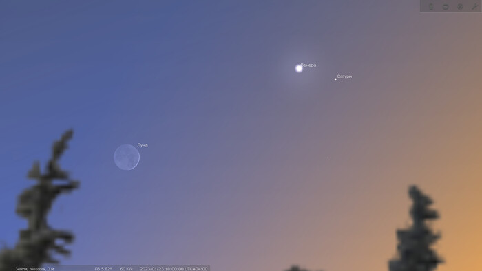 Венера, Сатурн и Луна вечером 23 января 2023 года
