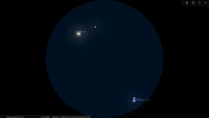 В Европе, к моменту захода Солнца и наступлению навигационных сумерек, когда Нептун можно будет отыскать в телескопы, пара светил уже немного разбежится, но все равно — даже несколько часов спустя Венера вечером 15 февраля все еще будет довольно близка к Нептуну.