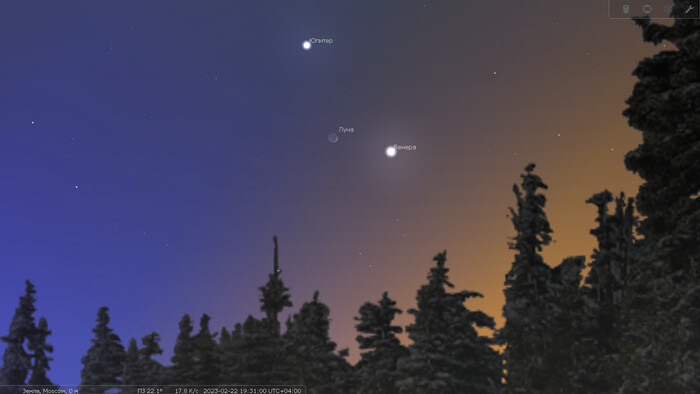 22 февраля на вечернем небе рядом с Венерой вновь окажется серп молодой Луны — в этот раз уже немного потолще и поярче — фаза Луны составит 8%.