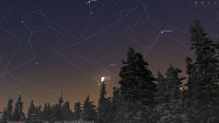 Оба светила будут расположены в созвездии Рыб. Продолжительность вечерней видимости Венеры и Юпитера в первые дни марта составит около 2,5 часов.