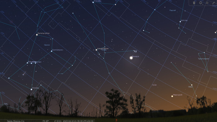 Венера между скопления Гиады и Плеяды вечером 18 апреля 2023 года
