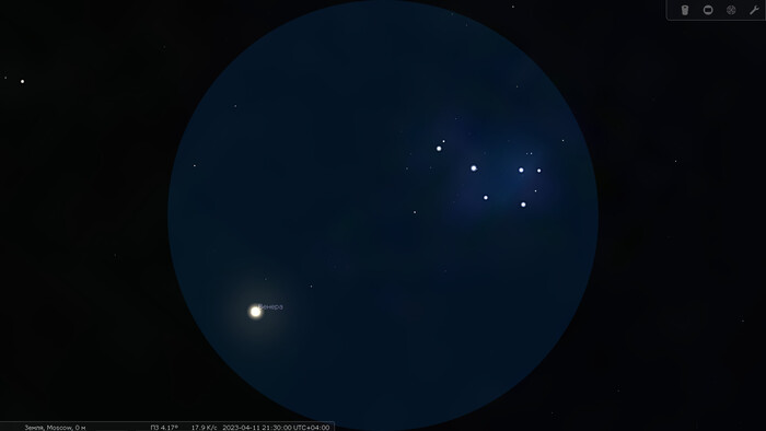 Ближе всего Венера будет к Плеядам 11 апреля — расстояние до скопления составит около 6°, и Венера будет южнее Плеяд.