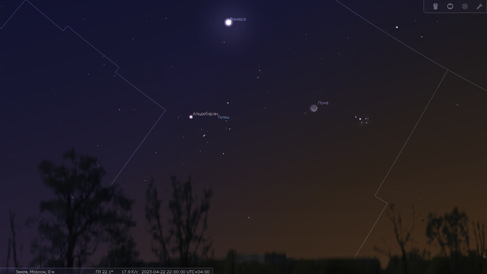 22 и 23 апреля 2023 года в этой звёздной гуще окажется еще и молодая Луна. 22 апреля она пройдет вблизи Плеяд, а 23-го более близко подойдет к Венере.