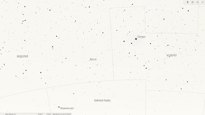 На полпути от Сатурна к Фомальгауту в бинокль или трубу можно отыскать светило 5-й с половиной звездной величины, медленно дрейфующее по созвездию Водолея. Это малая планета Веста — самая яркая и крупная из астероидов главного пояса. Как и Сатурн, Веста находится в условиях наилучшей видимости для этого года. Через пару дней произойдет противостояние Весты.