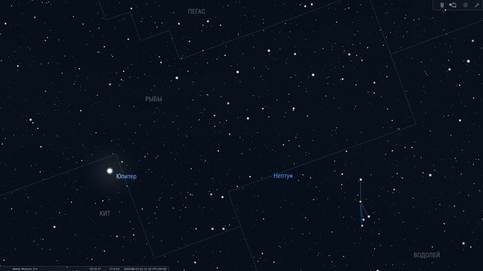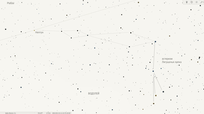 Голубоватый по цвету Нептун — самая далекая из известных планет Солнечной системы — находится на границе созвездий Водолея и Рыб. Найти его можно, если перебираться от звезды к звезде в восточном направлении от заметного и хорошо узнаваемого астеризма “Лягушачья лапка”. Но Нептун — объект слабый, заметный только в телескопы, и желательно, чтобы диаметр объектива телескопа был от 80 миллиметров и более. И конечно же нужен опыт поиска слабых едва отличающихся от звезд объектов среди россыпей светил схожих по яркости.