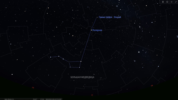 Эта линия укажет нам на звезду Гамма Цефея, имеющую собственное имя “Эльрай”. Это относительно слабая, но все же заметная глазом звезда 3-й звездной величины. На самом деле это довольно близкая к Солнцу (45 световых лет) система из двух звезд, вокруг одной из которых обнаружена планета. Эта звезда вторая по яркости в созвездии и с ней начинается наше знакомство с созвездием Цефея.