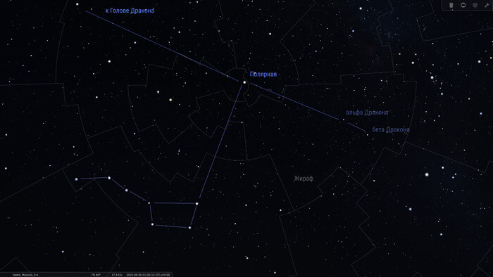 Как мы делали уже много раз, соединим крайние звезды черпалки Ковша — альфу и бету Большой Медведицы, и проведем линию ввысь, пока она не выведет к Полярной звезде — это примерно 5 расстояний между звездами альфа и бета Большой Медведицы. Но в этот раз мы двинемся дальше, и продолжим нашу линию дальше — за полярную звезду — еще на две такие “условные единицы”.