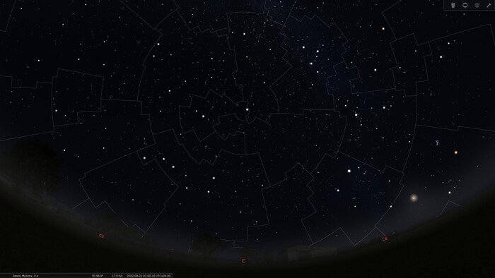 Юпитер, напротив, прекрасно виден без какой либо оптики — это ярчайшее светило предстоящей ночи, если не считать Луну, которая кстати, восходит до полуночи, не взирая на свою убывающую фазу и даже серповидность. Мы привыкли к тому, что старые лунные серпы видны лишь под утро. Но в начале осени у стареющей Луны в северном полушарии неоспоримый приоритет в условиях видимости. И этой ночью Вы сможете в этом еще раз убедиться.