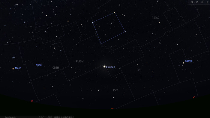 Над ярким Юпитером возвышается огромный — возможно, самый большой астеризм небосвода — квадрат Пегаса, сложенный из звезд 2-й звездной величины — сравнимых по яркости со звездами Ковша Большой медведицы. Если Вы увидите Юпитер, попробуйте отыскать и Квадрат Пегаса — самый большой звездный правильный квадрат.