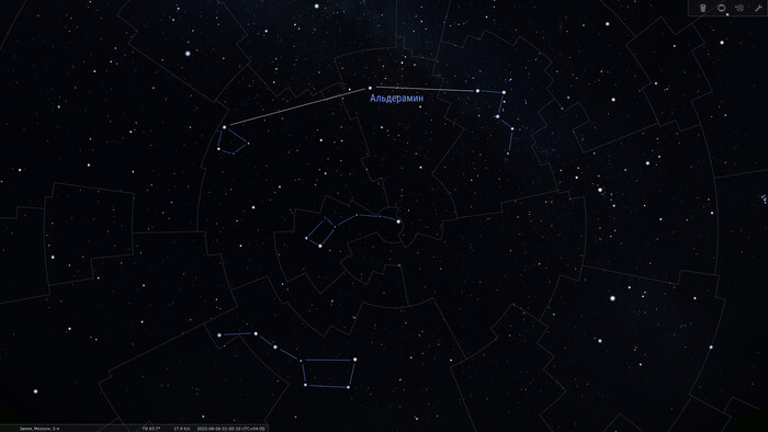 Самая яркая звезда Цефея — альфа — “Альдерамин” — легко находится посередине пути между крайней звездой Кассиопеи и Головой Дракона.