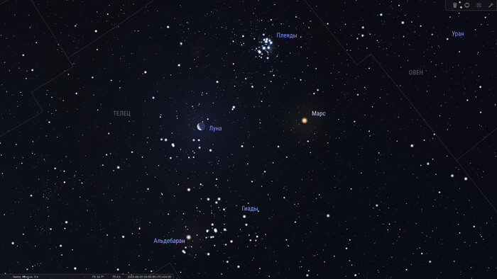 С полуночи становится хорошо видим Марс. Он расположен в созвездии Тельца, куда недавно перебрался из созвездия Овна, оставив там неторопливого Урана. Уран по прежнему в Овне, а Марс в ближайшие ночи сияет в окружении красивейших рассеянных скоплений Плеяды и Гиады и сближается с яркой звездой Альдебаран, возглавляющей созвездие Тельца и тоже обладающую красноватым оттенком.