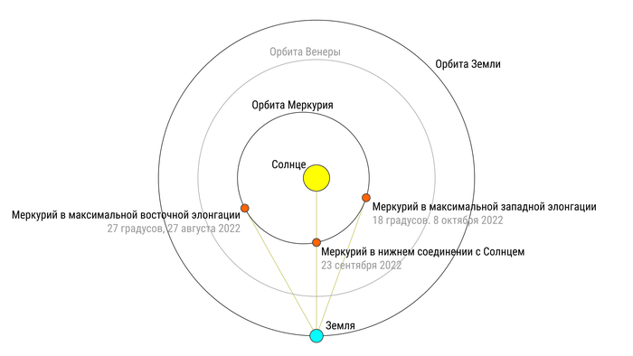 Через неделю Меркурий достигнет наибольшей восточной элонгации (27 градусов) и начнет стремительно сближаться с Солнцем, и через несколько дней после нижнего соединения с Солнцем (когда Меркурий проскользнет между Солнцем и Землей), начнется это утренняя видимость — гораздо более удобная для наблюдений в средних северных широтах нашей планеты.