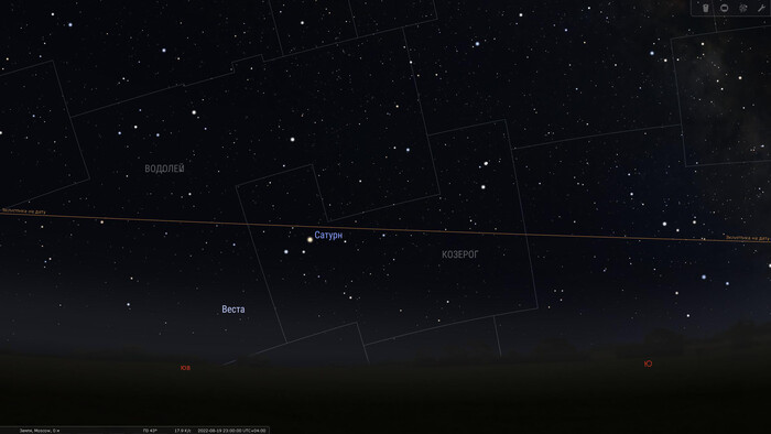 Неподалеку от Сатурна — в соседнем созвездии Водолея — в бинокль или подзорную трубу можно отыскать малую планету Веста, которая сейчас близится к противостоянию (23 августа 2022), а значит тоже находится в лучших условиях видимости. Сейчас в темных местах нашей планеты (за пределами города, а лучше всего — в горах) Весту можно увидеть невооруженным глазом. Веста — единственный астероид (малая планета), доступный для наблюдений без оптики.