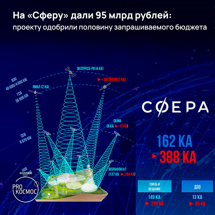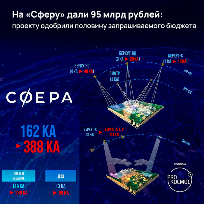 Согласно одобренному проекту, всего на орбиту будут выведены 162 спутника для 5 группировок наблюдения (ДЗЗ) и 5 группировок связи. Глава Роскосмоса Дмитрий Рогозин показал актуальный состав «Сферы» на форуме «Промышленная политика в новых реалиях» 26 мая. Pro космос, конечно, интереснее всего увидеть радикальное расширение группировки ДЗЗ с 13 до 99 КА.