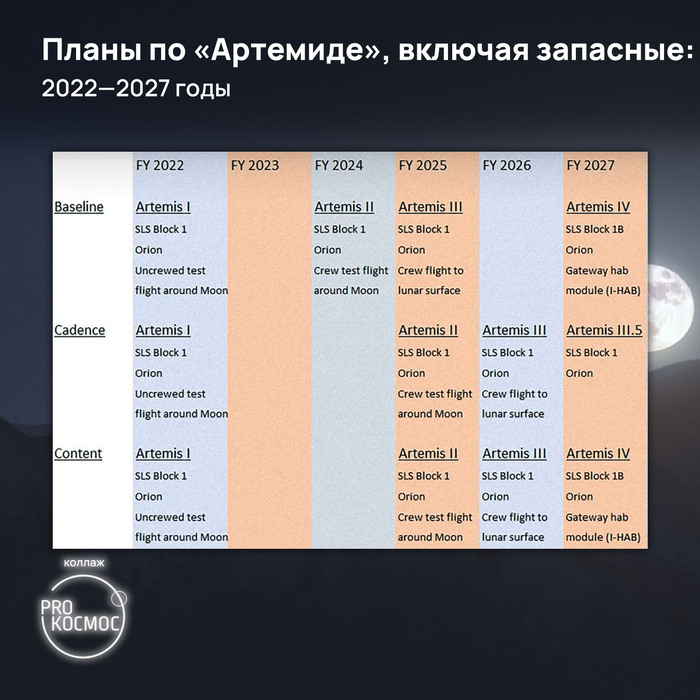 NASA заявляет, что придерживается «базового» официального графика пусков для Artemis, но он раз раз разом оказывается недостижим. Например, миссия Artemis III с высадкой на поверхность Луны точно перенесётся за 2025 г. из-за неготовности скафандров или задержки с созданием более мощной версии ракеты SLS — Block 1B. Она необходима, чтобы одним запуском отправить к Луне модуль станции Gateway и корабль Orion.
